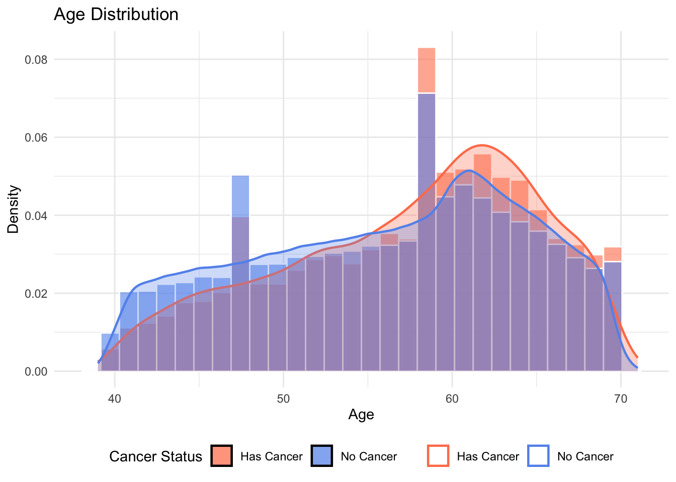 x = "Age", y = "Density", fill = "Cancer Status", color = NULL) +