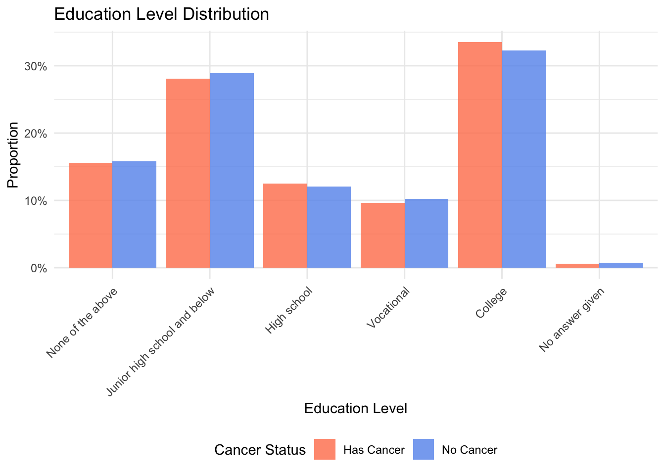 x = "Education Level", y = "Proportion", fill = "Cancer Status") +
