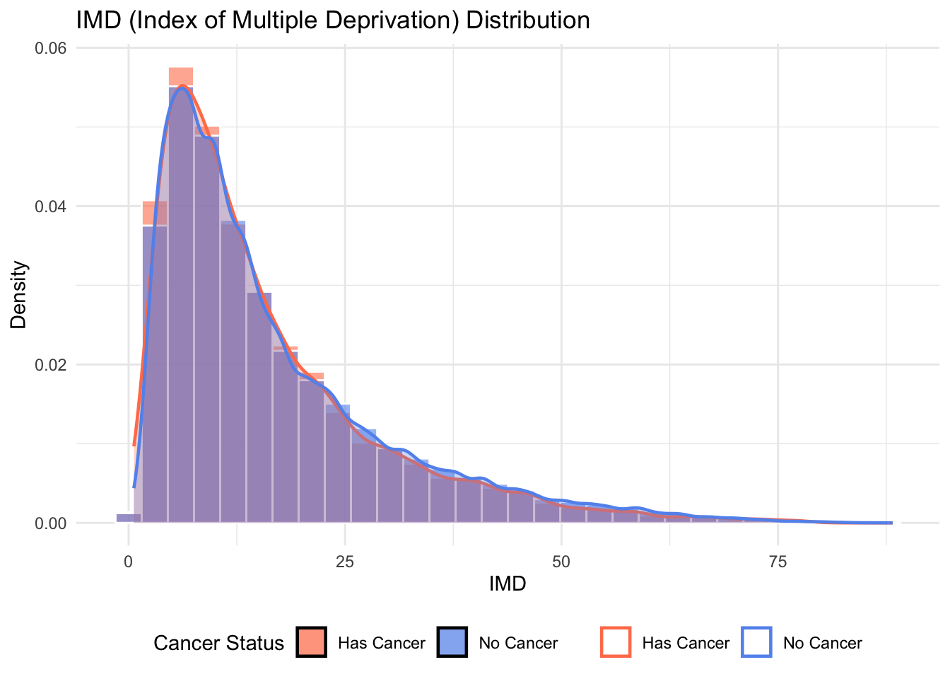 x = "IMD", y = "Density", fill = "Cancer Status", color = NULL) +