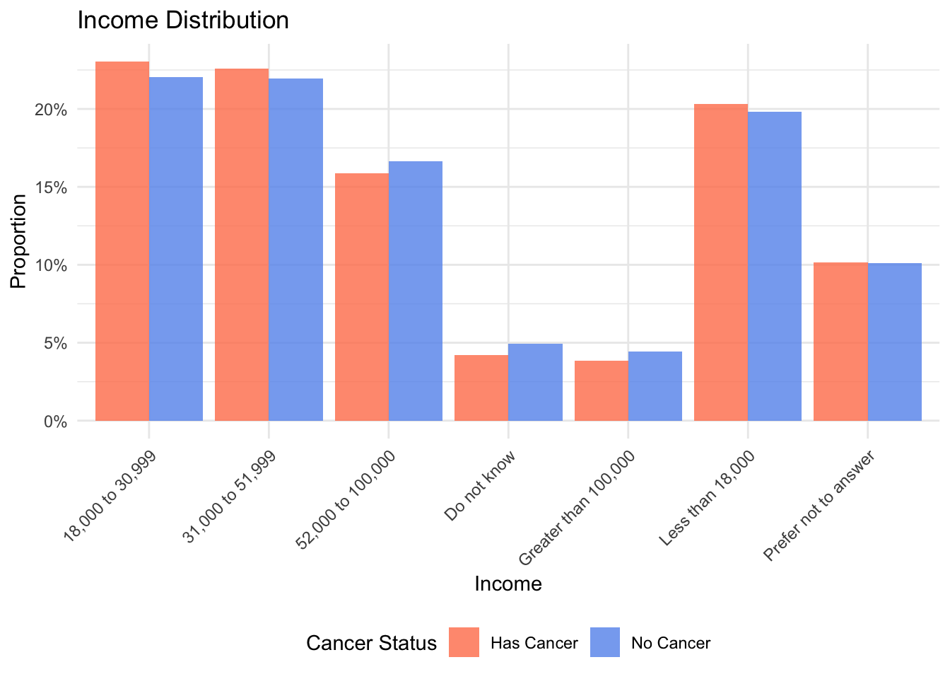 x = "Income", y = "Proportion", fill = "Cancer Status") +