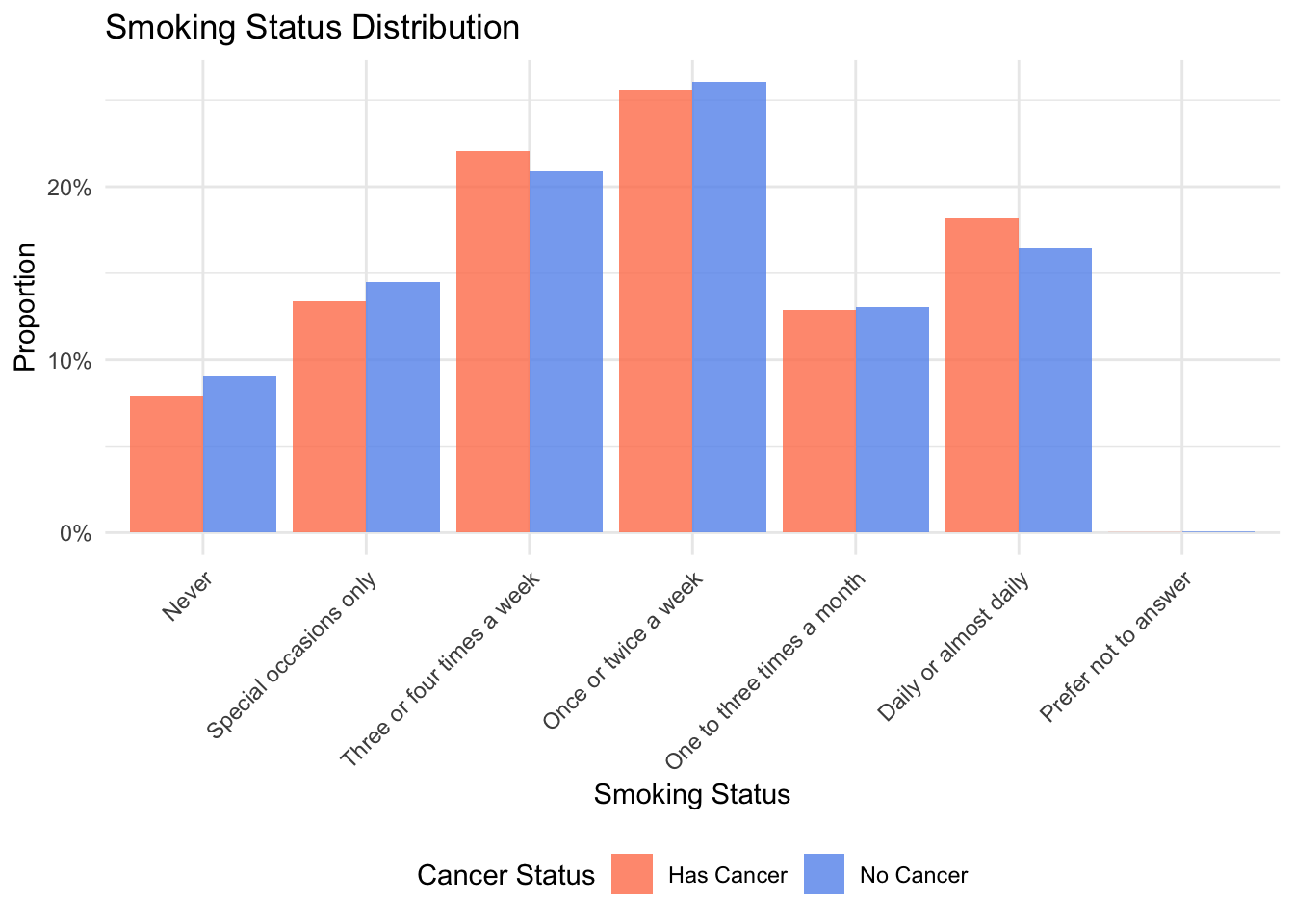 x = "Smoking Status", y = "Proportion", fill = "Cancer Status") +