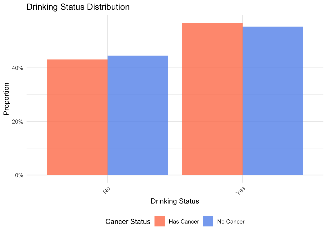 x = "Drinking Status", y = "Proportion", fill = "Cancer Status") +