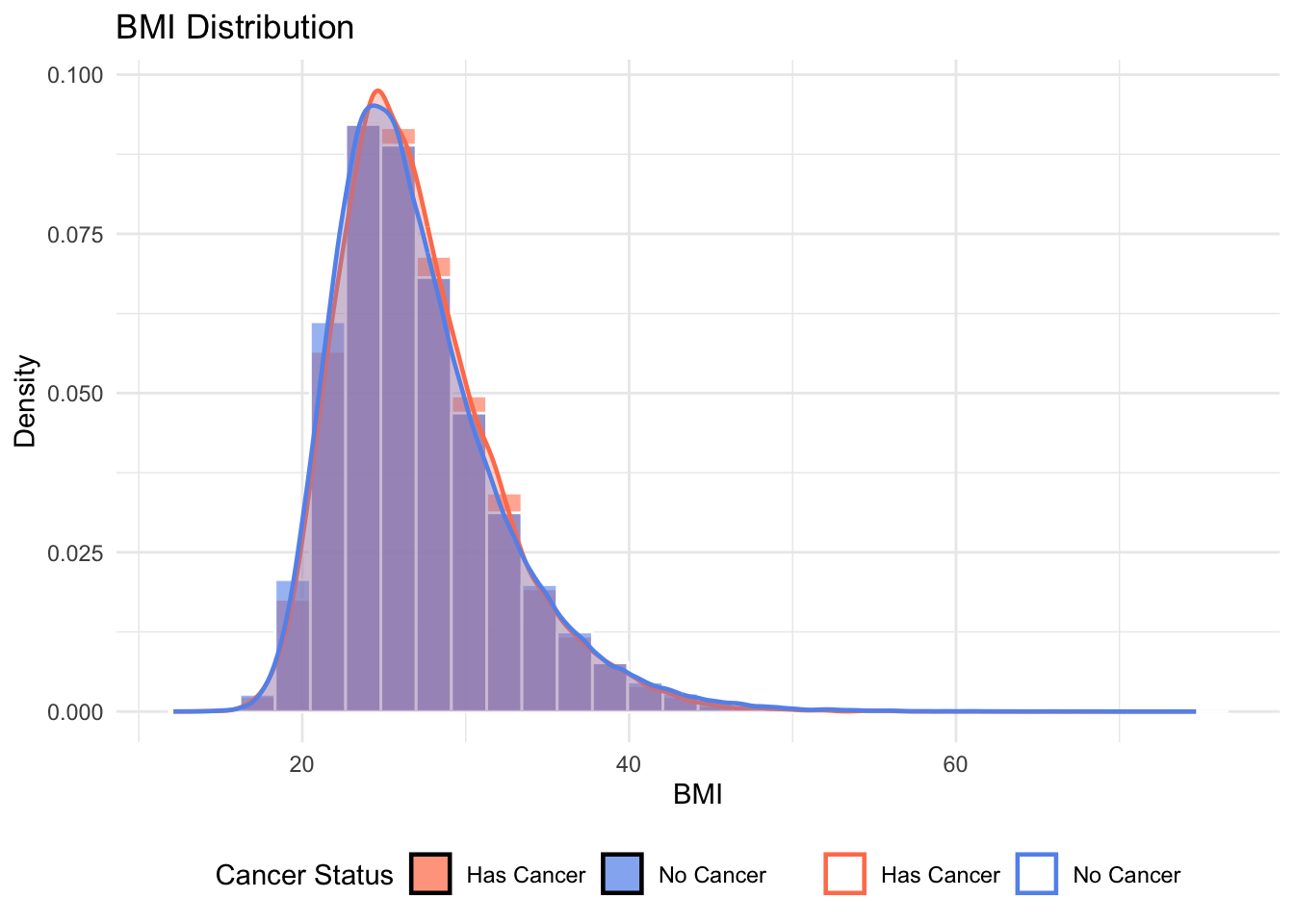 x = "BMI", y = "Density", fill = "Cancer Status", color = NULL) +