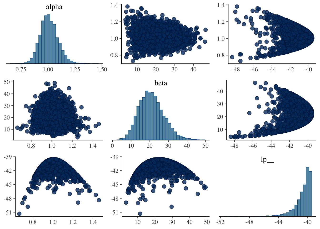 # Check pairs plot for sampling problemsmcmc_pairs(fit)